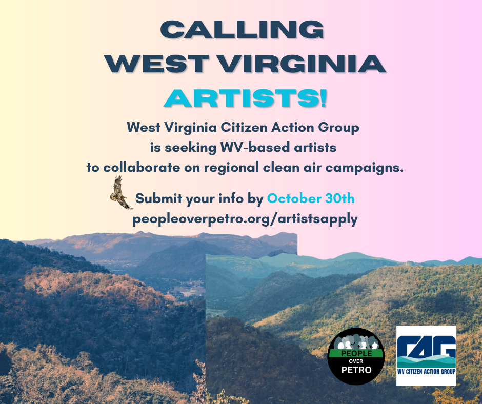 West Virginia Citizen Action Group (WVCAG) and People Over Petro Coalition (POPCO) are seeking to commission a West Virginia-based visual artist/illustrator to collaborate on creating artwork around regional air quality issues, such as industrial pollution threats in the Kanawha Valley.